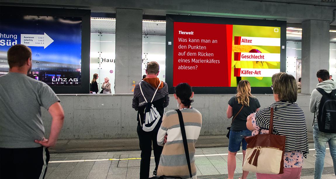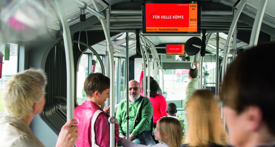 Ob im Bus, in der Straßenbahn, in der U-Bahn oder auf der Straße: Der Infoscreen ist unglaublich sichtbar. Ein Medium, so jung und flexibel wie seine Zielgruppe. Nicht nur unser umfassendes Informations- und Unterhaltungsprogramm kann sich sehen lassen, auch höchste Aufmerksamkeitswerte und niedrigste TKPs sind einen Blick wert.
